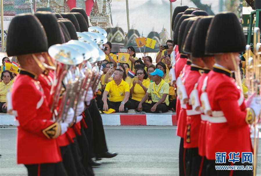 5月5日,儀仗隊在曼谷大王宮附近舉行的泰國國王加冕典禮巡游上列隊前進。 新華社記者 張可任 攝
