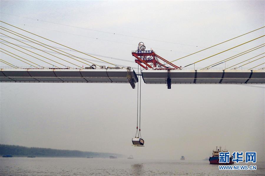 工人在池州長江公路大橋施工現(xiàn)場吊裝最后一塊鋼箱梁(3月29日攝)。 新華社記者曹力攝