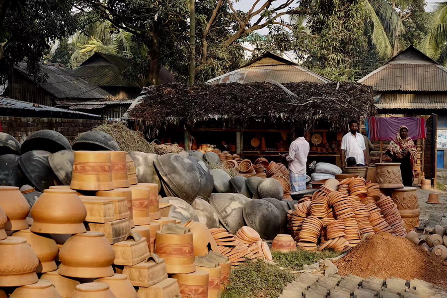 達卡遠郊區(qū)一個印度教徒聚居的村莊,幾乎家家戶戶都開辦制陶作坊,以傳統(tǒng)工藝制作陶盆、陶罐、陶盤和建筑裝飾陶器,遠銷孟加拉國內各地。李仁奇 攝