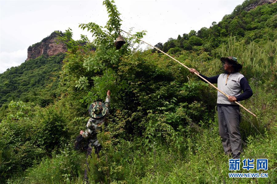 5月10日,在甘肅省隴南市徽縣大河店鎮(zhèn)硬灣村,蜂農(nóng)周仲頤(右)在收蜂。 甘肅省隴南市徽縣大河店鎮(zhèn)硬灣村位于秦巴山區(qū)深處,2017年,在當(dāng)?shù)卣姆龀窒拢堁吕铣裁垧B(yǎng)殖農(nóng)民專業(yè)合作社成立,蜂農(nóng)們將傳統(tǒng)養(yǎng)蜂技藝和現(xiàn)代加工方式相結(jié)合,并通過(guò)電商等渠道打開銷路,有效帶動(dòng)了當(dāng)?shù)刎毨Т迕衩撠氈赂?。目前整個(gè)合作社共有蜂箱2000余個(gè),每箱每年可帶來(lái)三四千元的收入。 新華社記者 馬寧 攝