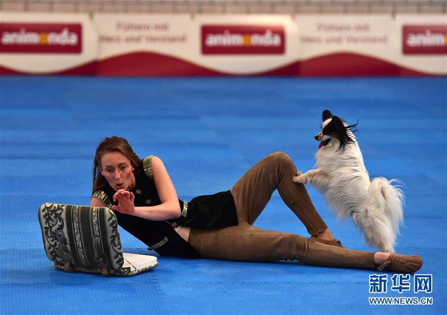 5月19日,在德國多特蒙德舉行的寵物展上,一名女士帶著愛犬參加寵物跳舞比賽。 為期三天的德國多特蒙德“狗和貓”寵物展19日落幕。寵物展期間,人們帶著自己的“萌寵”來到會場,參與寵物跳水、舞蹈、選美等趣味比賽,并與其他寵物愛好者及展商交流互動。 新華社記者逯陽攝