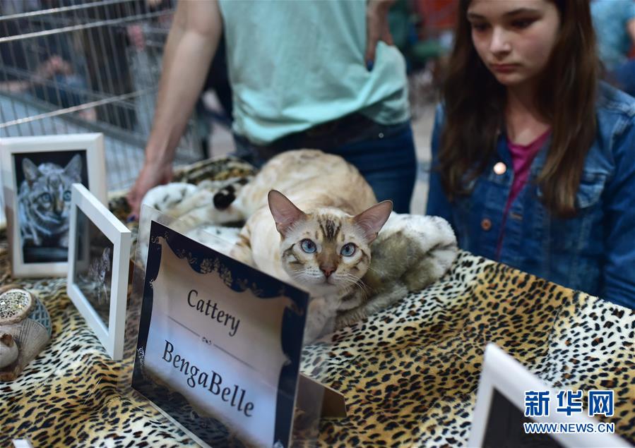 這是5月19日在德國多特蒙德舉行的寵物展上拍攝的一只孟加拉貓。 為期三天的德國多特蒙德“狗和貓”寵物展19日落幕。寵物展期間,人們帶著自己的“萌寵”來到會場,參與寵物跳水、舞蹈、選美等趣味比賽,并與其他寵物愛好者及展商交流互動。 新華社記者逯陽攝