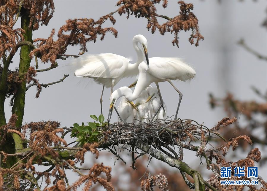 在江西省南昌市新建區(qū)象山森林公園內(nèi),白鷺和自己的雛鳥在一起(5月21日攝)。 近日,在江西省南昌市新建區(qū)象山森林公園內(nèi),已安家筑巢的大批鷺鳥陸續(xù)孵化出了后代。象山森林公園有著“鷺鳥王國(guó)”的美譽(yù),生態(tài)環(huán)境良好,每年都會(huì)吸引白鷺、蒼鷺、夜鷺等種類的鷺鳥飛抵棲息和繁衍后代。 新華社記者 彭昭之 攝