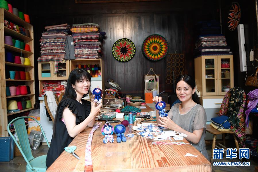 5月26日,在石舍村共同經(jīng)營(yíng)“三只蝸牛”手工藝品商店和客棧的姐妹陳紫畫(huà)(右)、陳莫寒在展示制作的手工藝品。 石舍村是浙江省桐廬縣富春江鄉(xiāng)村慢生活體驗(yàn)區(qū)中的三個(gè)村落之一,位置偏僻,依溪而居,風(fēng)景秀美。近年來(lái),石舍村結(jié)合古建筑保護(hù)工作,在清潔、美化村莊的基礎(chǔ)上,對(duì)一些廢棄古建筑進(jìn)行修繕,引入咖啡館、民宿等文化創(chuàng)意類項(xiàng)目,優(yōu)良的生態(tài)環(huán)境和濃郁的文化氛圍吸引大批游客前來(lái)體驗(yàn),小山村走上了一條發(fā)展美麗經(jīng)濟(jì)之路。2018年,石舍村接待游客10萬(wàn)8千余人次,旅游經(jīng)營(yíng)凈收入1260余萬(wàn)元。 新華社記者 黃宗治 攝