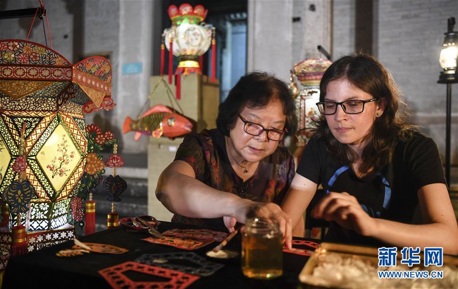 國(guó)家級(jí)非遺傳承人楊玉榕(左)在古驛道陳芳家宅外廣場(chǎng)指導(dǎo)外國(guó)留學(xué)生制作彩燈(5月31日攝)。