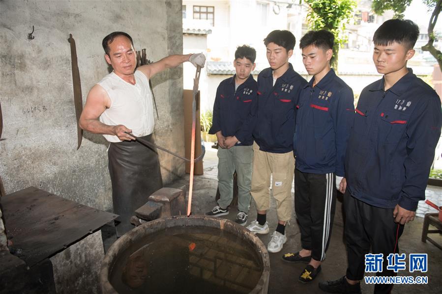 5月21日,鄭國榮在“古越劍鋪”向徒弟們傳授寶劍淬火技藝。  新華社記者 翁忻旸 攝