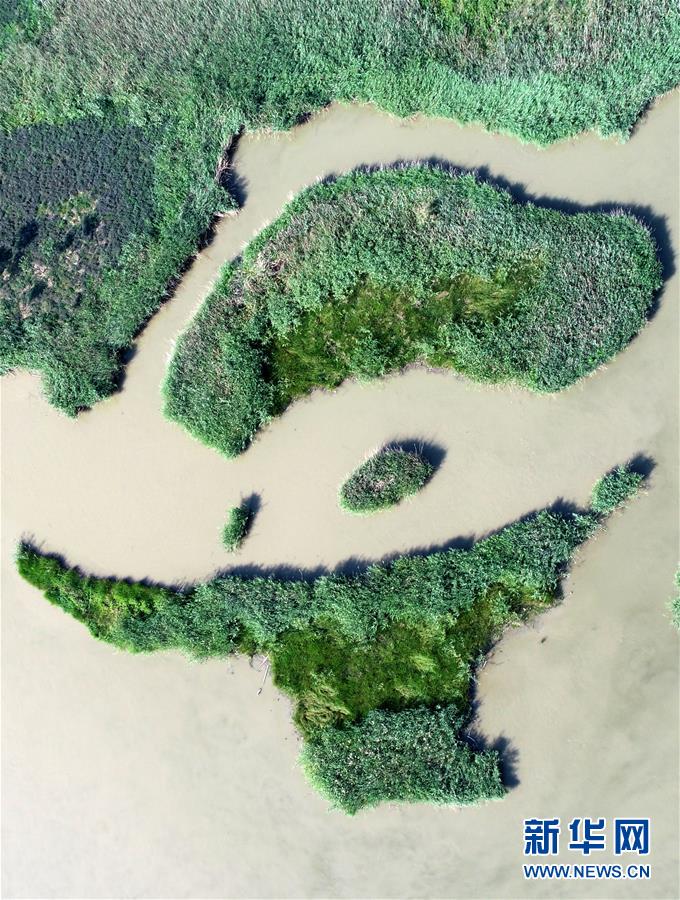 這是天津市寧河區(qū)七里海濕地內(nèi)蘆葦和水面形成的圖案(6月22日無人機拍攝)。