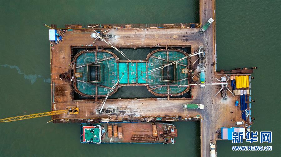 這是7月6日無人機拍攝的湛江調(diào)順跨海大橋東岸主塔墩承臺建設(shè)現(xiàn)場。 新華社記者 劉大偉 攝
