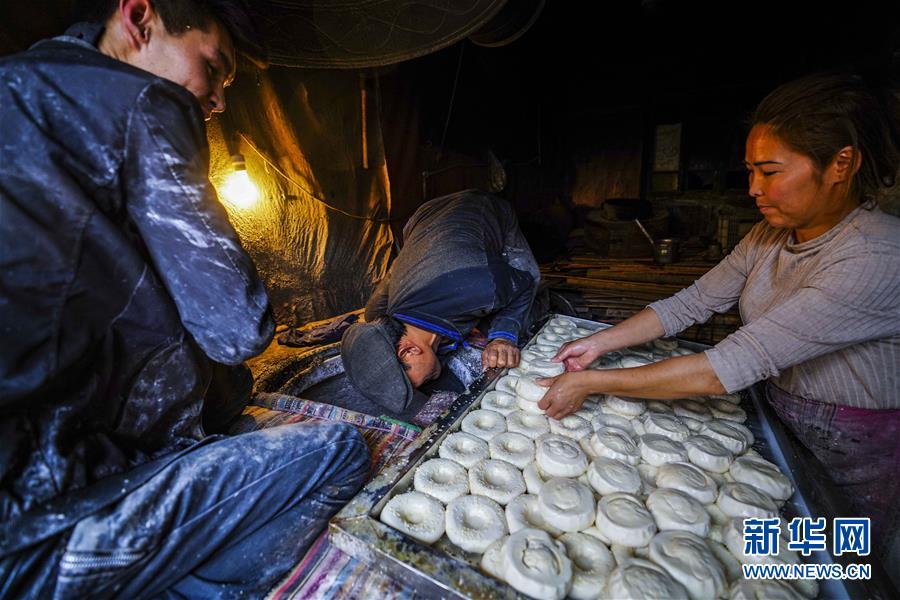 7月7日,在喀什古城景區(qū)一間馕鋪里,商販在打馕。 新華社記者 趙戈 攝