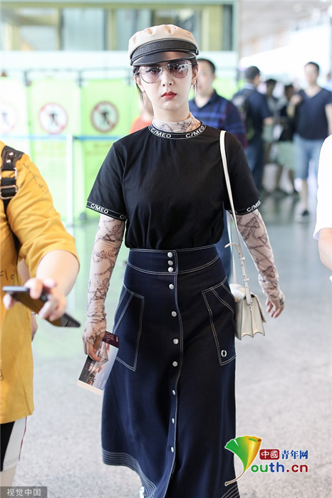 2019年7月25日,北京,楊紫現(xiàn)身機(jī)場。她穿黑色短T配牛仔裙變時髦女郎,戴報童帽架墨鏡”港風(fēng)女sir“即視感,人氣爆棚。