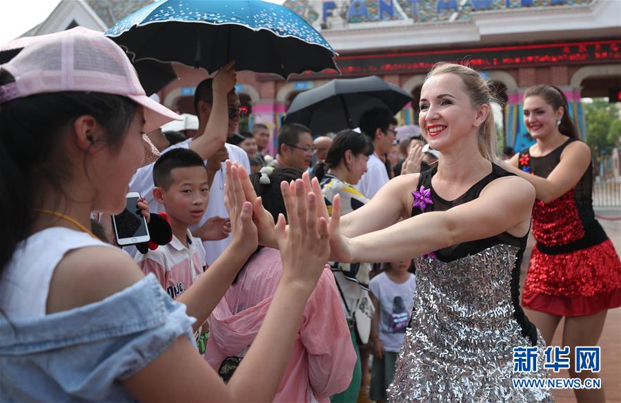 7月31日,列娜(前排左)在沈陽方特歡樂世界門前表演舞蹈。