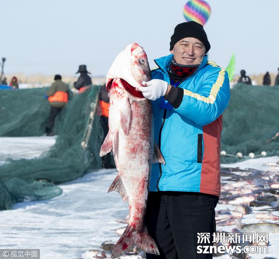 2019年1月21日,新疆阿勒泰,漁民以傳統(tǒng)的捕魚方式,向游客展示“踏雪尋魚”的捕魚文化。