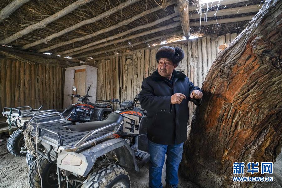 在羅布人村寨,阿木東·艾不東介紹家中的胡楊(1月29日攝)。他準(zhǔn)備將這棵胡楊好好打造一下,吸引更多的游客到來。新華社記者 趙戈 攝