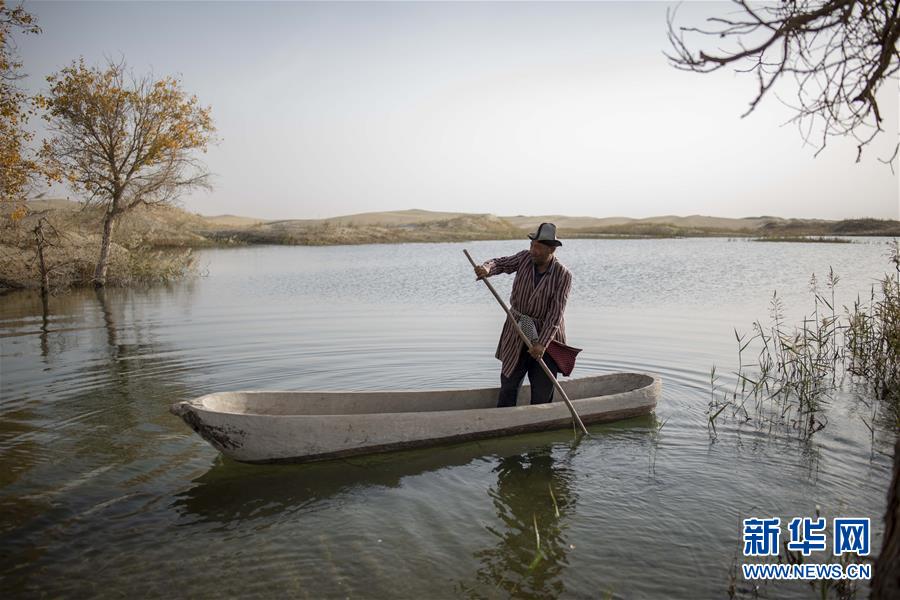 在羅布人村寨,阿木東·艾不東劃著卡盆準(zhǔn)備去捕魚(yú)(2018年10月16日攝)。新華社記者 趙戈 攝
