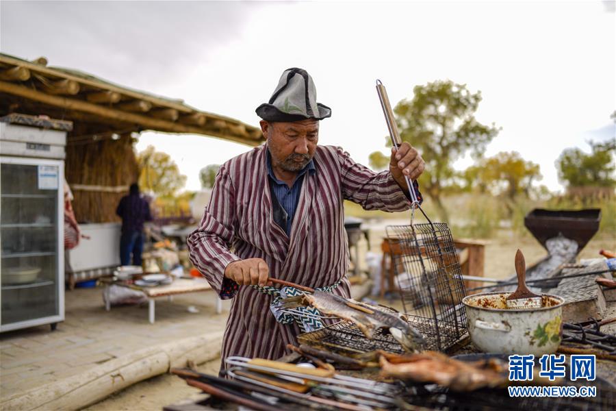 在羅布人村寨,阿木東·艾不東在家中制作羅布烤魚(2018年10月16日攝)。新華社記者 趙戈 攝