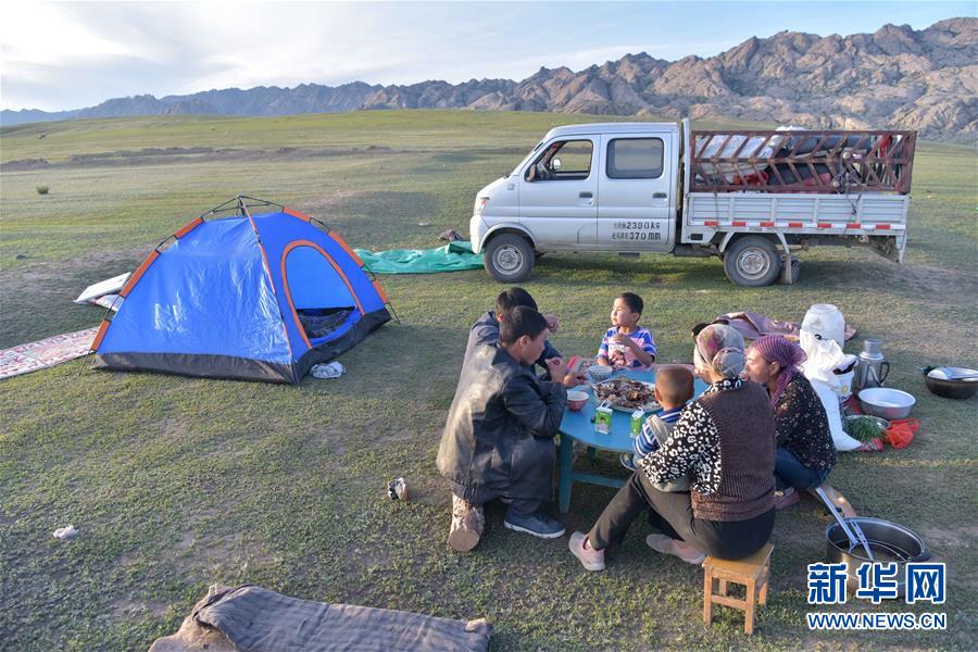 在新疆阿勒泰地區(qū)福??h,牧民在轉(zhuǎn)場途中吃晚餐(6月5日攝)。新華社記者丁磊攝