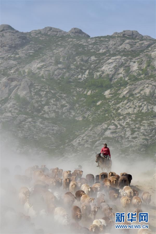 6月6日,新疆阿勒泰地區(qū)福??h牧民趕著轉(zhuǎn)場(chǎng)牲畜翻越山頭。 新華社記者 丁磊 攝