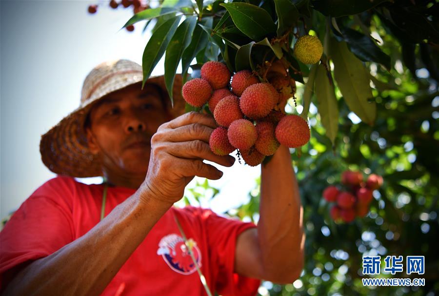 海口市三門(mén)坡鎮(zhèn)農(nóng)民在果園采摘荔枝(2019年5月15日攝)。 新華社記者郭程攝