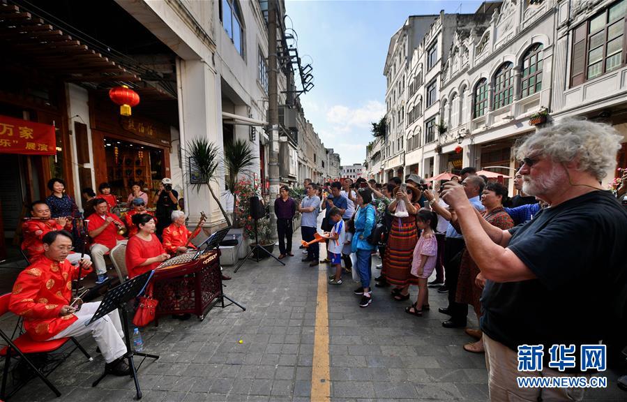 游客在海口中山路騎樓老街觀看海南八音樂(lè)器表演(2019年2月6日攝)。新華社記者郭程攝