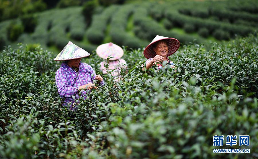 五指山市水滿(mǎn)鄉(xiāng)毛腦村貧困戶(hù)王金花(右一)在五指山椰仙茶園采茶,她在2012年進(jìn)入茶園工作,2016年脫貧(2018年11月15日攝)。新華社記者郭程攝