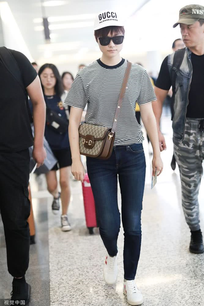 李宇春條紋裝扮現(xiàn)身機場,青春活力,人氣爆棚