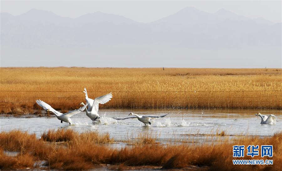 幾只白天鵝從甘肅省酒泉市阿克塞哈薩克族自治縣境內的小蘇干湖濕地水面起飛(4月5日攝)。新華社記者 陳斌 攝