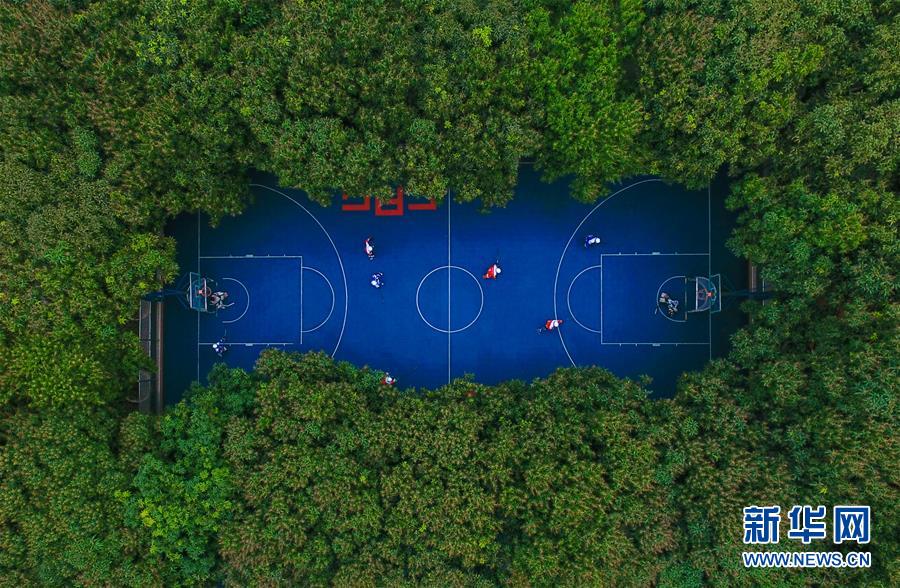 這是被綠蔭環(huán)繞的廣州第四十一中學運動場(2017年3月16日無人機拍攝)。  新華社記者 劉大偉 攝