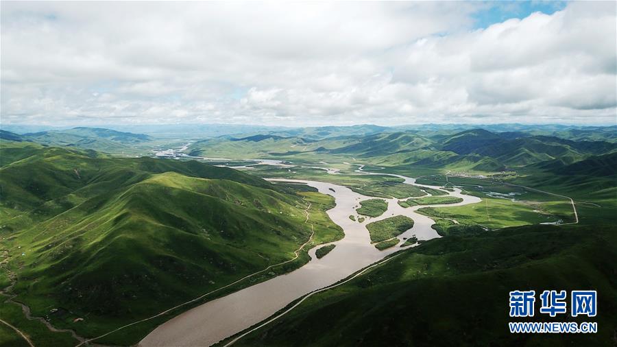 黃河流經的甘肅省甘南藏族自治州瑪曲縣境內濕地和草原(6月23日無人機拍攝)。新華社記者 陳斌 攝