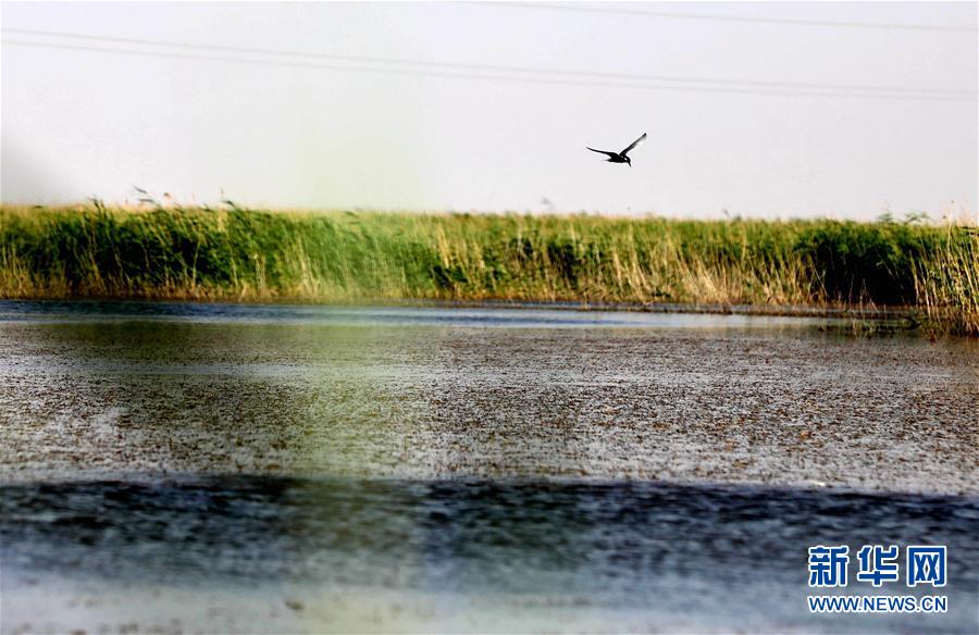 一只候鳥在青土湖水面飛翔(6月13日攝)。位于巴丹吉林沙漠和騰格里沙漠夾縫中的青土湖,是甘肅省武威市民勤縣的“沙漠之湖”,也是當地生態(tài)變遷的“晴雨表”。新華社記者 郭剛 攝