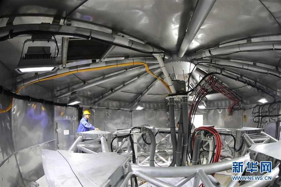 8月28日,工作人員在FAST饋源艙內(nèi)進行檢修。 新華社記者 歐東衢 攝
