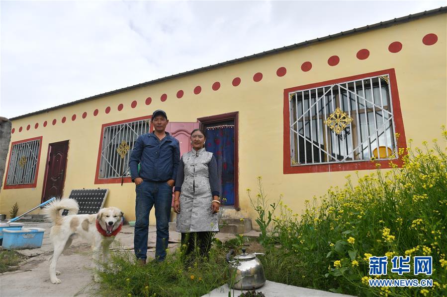 在青海省玉樹藏族自治州治多縣治渠鄉(xiāng)同卡村,村民昂文西讓和妻子布沙措江卓瑪站在易地搬遷的新家院子里合影(9月12日攝)。新華社記者 孫瑞博 攝
