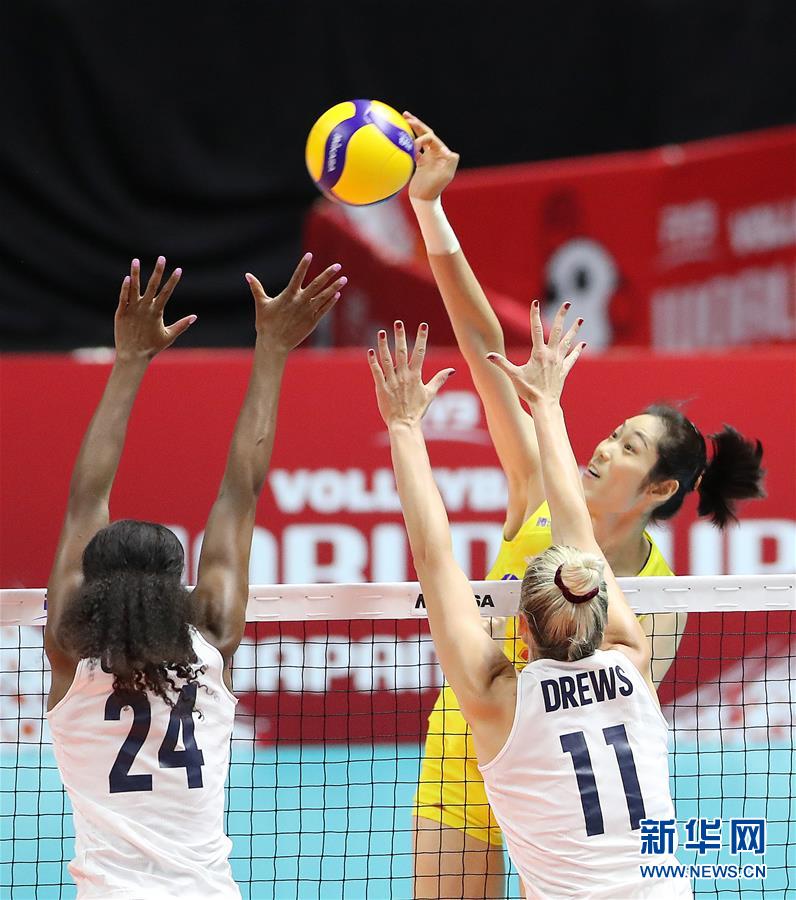 9月23日,中國隊球員顏妮(中)在比賽中扣球。當(dāng)日,在日本札幌舉行的2019年女排世界杯賽第二階段A組循環(huán)賽中,中國隊以3比0戰(zhàn)勝美國隊。新華社記者杜瀟逸攝