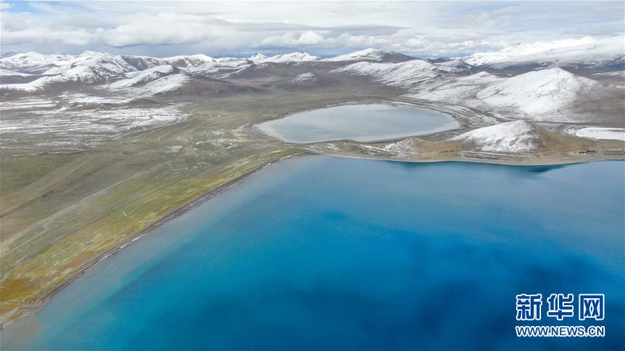 9月24日無人機拍攝的拿日雍錯。拿日雍錯位于西藏山南市錯那縣北部,海拔4900米,像藍寶石般鑲嵌在雪山草原之間。新華社記者晉美多吉攝