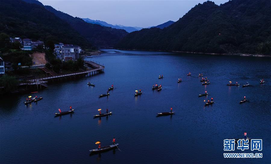 9月25日,在宋村鄉(xiāng)云源港的水面上,漁民劃著漁船,船頭點亮漁燈,構成一幅“漁舟唱晚、萬家燈火”的美麗圖景(無人機拍攝)。 近年來,浙江省杭州市淳安縣宋村鄉(xiāng)積極發(fā)展鄉(xiāng)村旅游,打造漁家元素特色景觀,助力鄉(xiāng)村振興建設。目前,宋村鄉(xiāng)依托山水景觀和漁家文化,帶動了當地精品民宿和集沙灘嬉水、自助燒烤、農事體驗、民俗攝影采風為一體的特色旅游發(fā)展。2019年1月初至7月底,全鄉(xiāng)接待游客10萬人次,實現(xiàn)旅游經濟收入1300萬元。 新華社記者 徐昱 攝