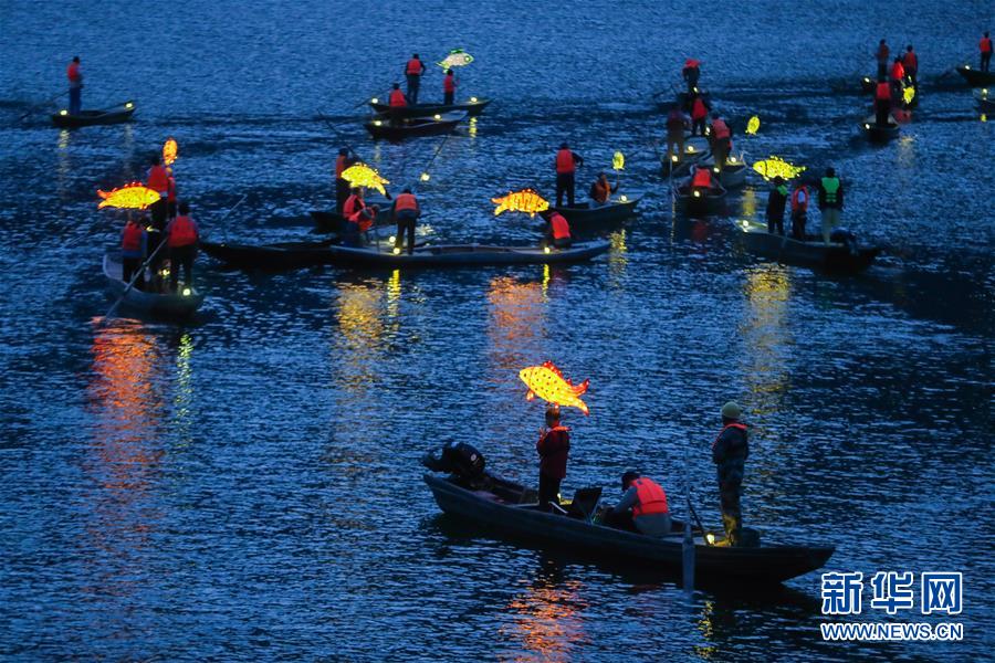 9月25日,在宋村鄉(xiāng)云源港的水面上,漁民劃著漁船,船頭點亮漁燈,構(gòu)成一幅“漁舟唱晚、萬家燈火”的美麗圖景(無人機拍攝)。 近年來,浙江省杭州市淳安縣宋村鄉(xiāng)積極發(fā)展鄉(xiāng)村旅游,打造漁家元素特色景觀,助力鄉(xiāng)村振興建設(shè)。目前,宋村鄉(xiāng)依托山水景觀和漁家文化,帶動了當?shù)鼐访袼藓图碁╂宜?、自助燒烤、農(nóng)事體驗、民俗攝影采風為一體的特色旅游發(fā)展。2019年1月初至7月底,全鄉(xiāng)接待游客10萬人次,實現(xiàn)旅游經(jīng)濟收入1300萬元。 新華社記者 徐昱 攝