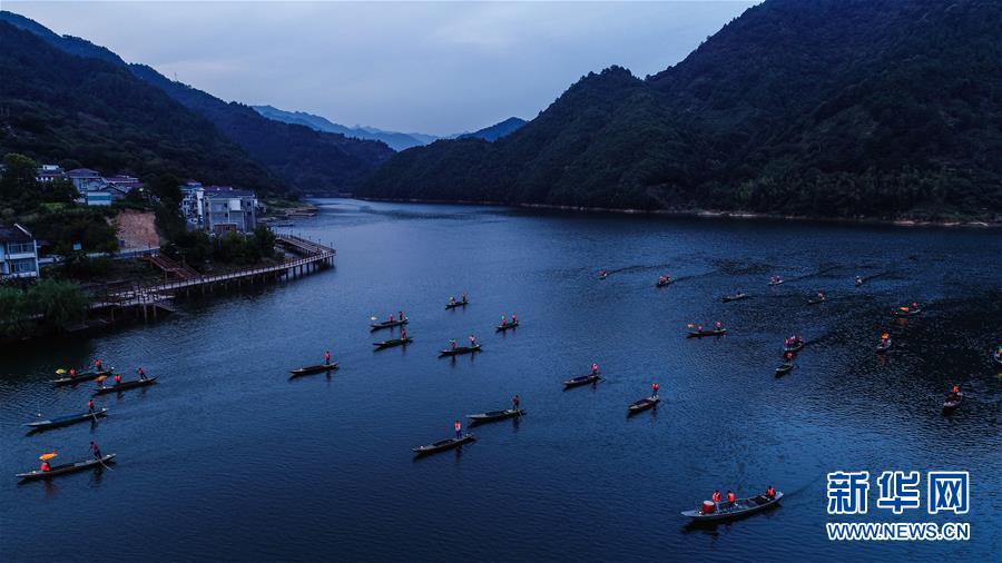 9月25日,在宋村鄉(xiāng)云源港的水面上,漁民劃著漁船,船頭點(diǎn)亮漁燈,構(gòu)成一幅“漁舟唱晚、萬(wàn)家燈火”的美麗圖景,與沿湖民宿群落交相輝映(無(wú)人機(jī)拍攝)。  新華社記者 徐昱 攝
