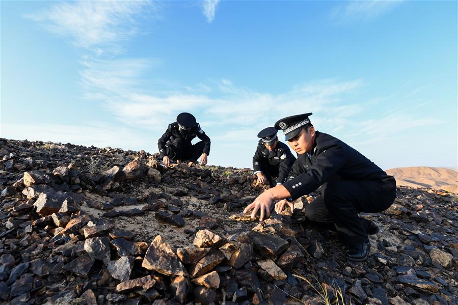 9月27日,內(nèi)蒙古自治區(qū)額濟(jì)納旗算井子邊境派出所民警在大紅山上維護(hù)整理石塊。新華社記者劉磊攝