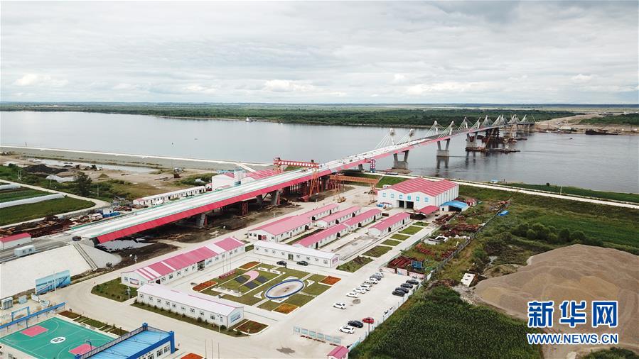 正在進行橋面鋪裝施工作業(yè)的黑河到布拉戈維申斯克黑龍江(阿穆爾河)大橋(8月19日無人機拍攝)。新華社記者 王建威 攝