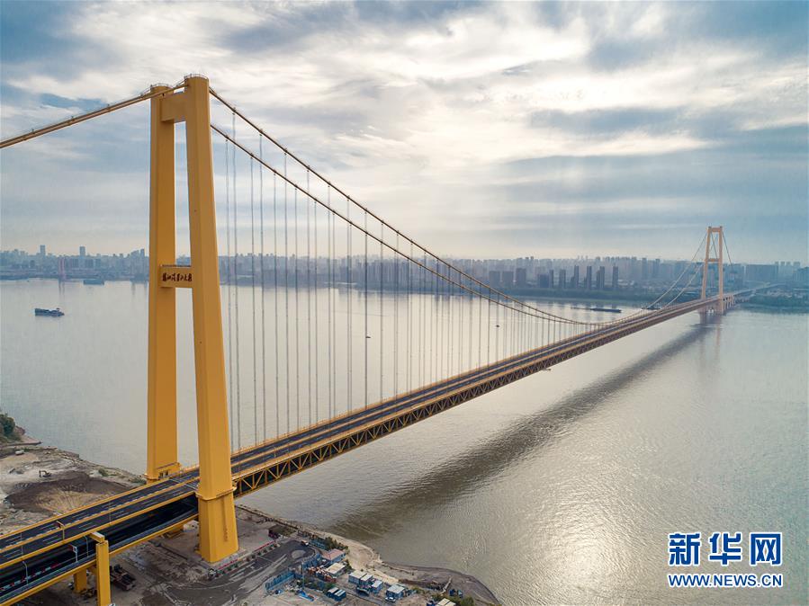 楊泗港大橋建設(shè)創(chuàng)造了多項(xiàng)世界之最:一是主橋跨度達(dá)1700米,為世界上跨度最大的雙層懸索橋;二是主橋設(shè)置雙層雙向12車道,是世界上通行能力最大的公路橋梁;三是大橋主纜設(shè)計(jì)張力6.5萬噸,采用了世界上強(qiáng)度等級最高的主纜鋼絲;四是大橋設(shè)置機(jī)動(dòng)車道、非機(jī)動(dòng)車道、人行觀光道,集過江交通與觀光于一體,是長江上功能最完備的橋梁。新華社記者熊琦攝