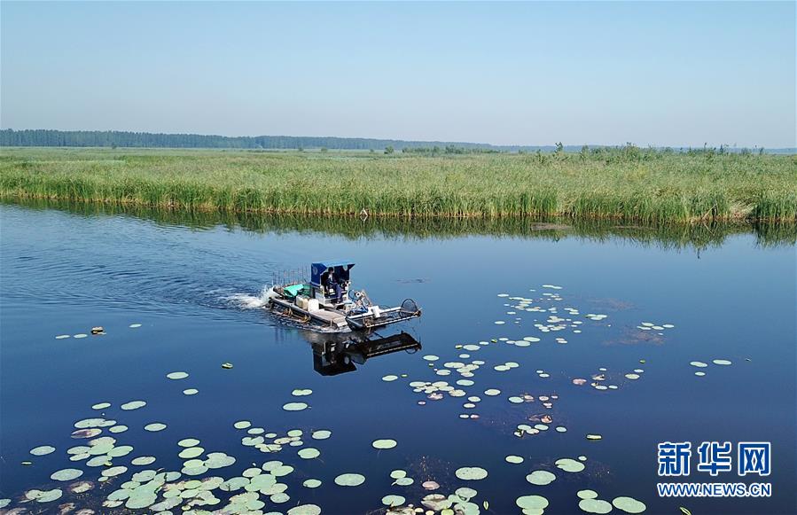 一艘打撈船在白洋淀景區(qū)內(nèi)清理漂浮物(8月31日無人機(jī)拍攝)。新華社記者牟宇攝