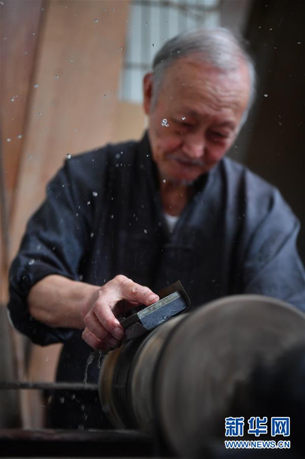 10月12日,丁國坤在家中對一件未成形的脫胎漆器進(jìn)行“水磨”工序。新華社記者胡晨歡攝