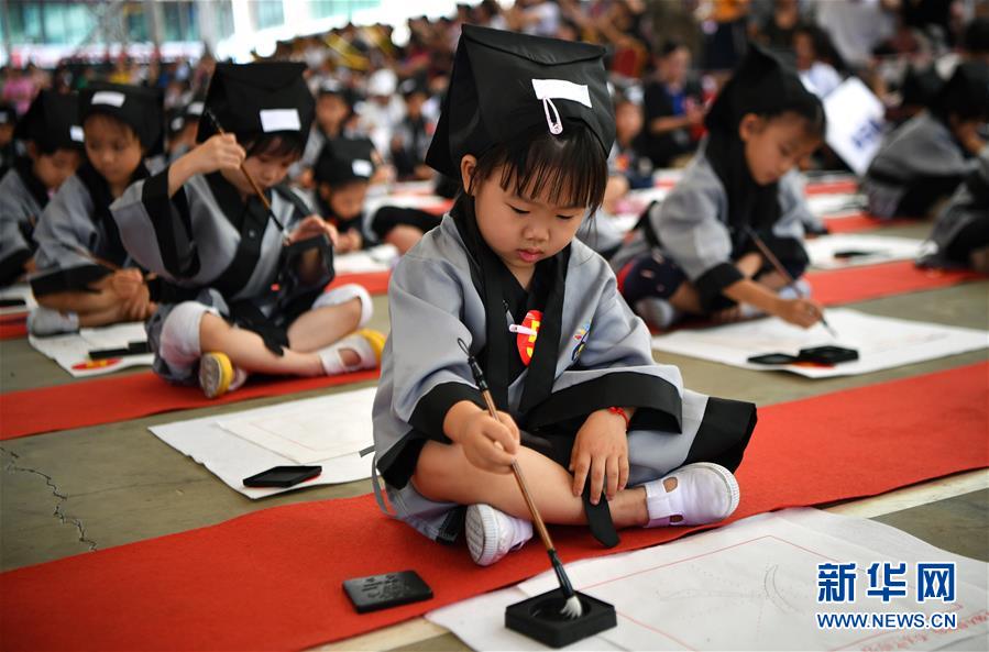10月13日,參加儀式的小朋友在蘸墨寫字。當日,??诤嬌賰核囆g中心為500名小朋友舉行“開筆禮”,通過“點朱砂,啟智慧”“習書法,描人字”等儀式讓孩子們體驗中國傳統(tǒng)文化。新華社記者郭程攝