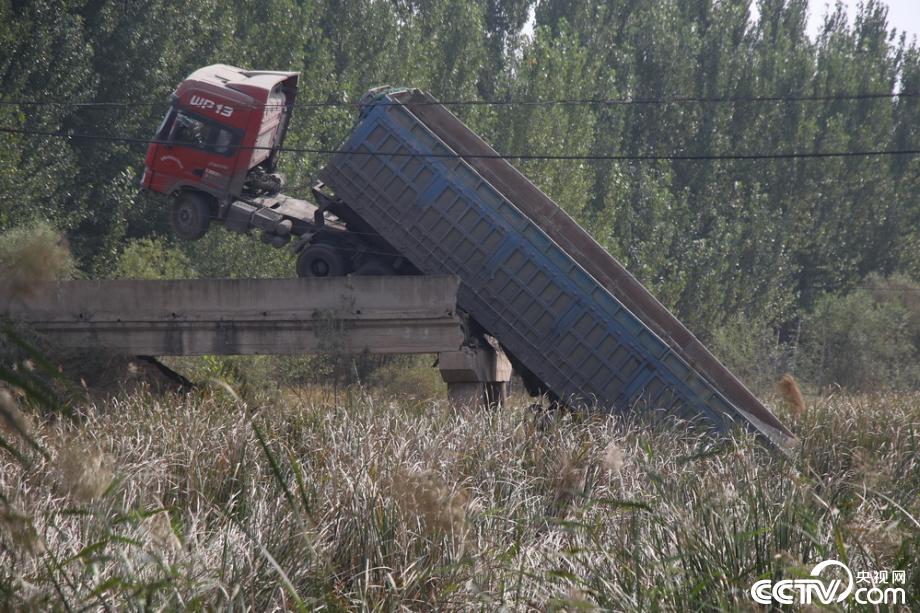 2019年10月13日,山東濱州,一輛滿載貨物的大貨車路過當(dāng)?shù)匾蛔鶎?米左右的小橋時,致使橋面坍塌。據(jù)報道,13日凌晨4點(diǎn)左右,一輛重型半掛貨車沿渤海十八路由南向北行駛至市西辦事處李茂家村附近,右轉(zhuǎn)彎進(jìn)入連接渤海十八路與李茂家村村西鄉(xiāng)間路的一座寬4米左右的小橋時,致使橋面坍塌?,F(xiàn)場貨車呈翹起之勢,車頭懸于半空中,車尾插入水中,事故未造成人員傷亡。據(jù)現(xiàn)場了解,該橋建設(shè)于1974年,橋頭有警示標(biāo)識,警示承載4噸。目前救援工作正在緊張有序地進(jìn)行中。視覺中國