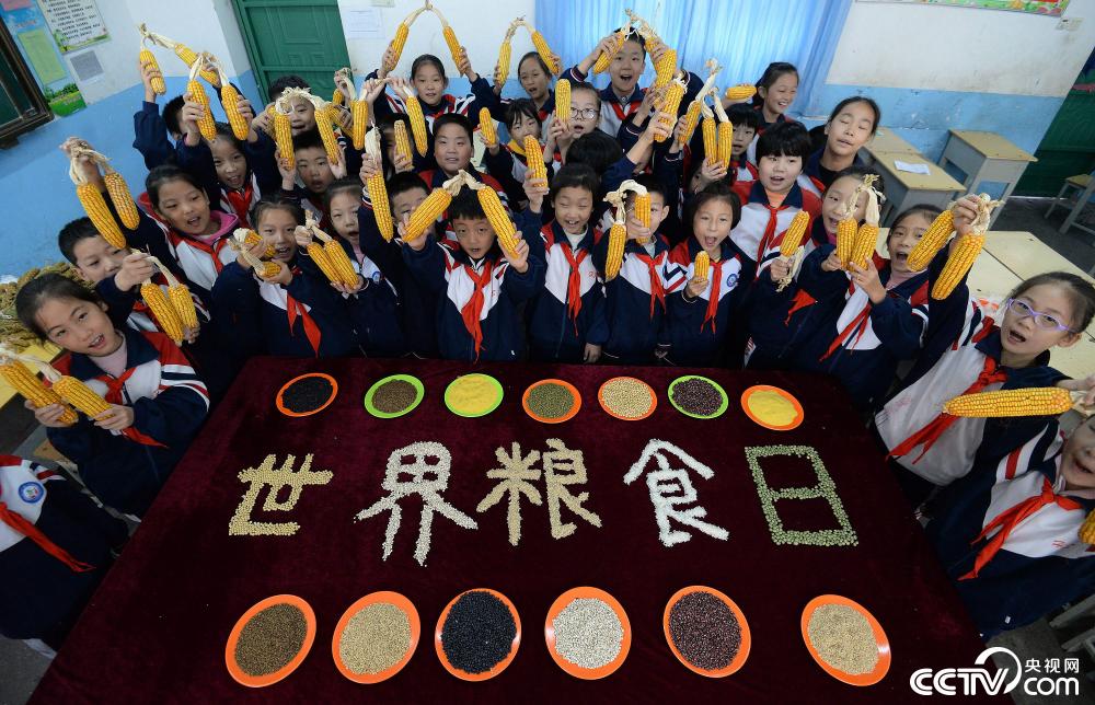 2019年10月15日,河北省邯鄲市邯山區(qū)滏河學(xué)校的學(xué)生們用糧食作物拼成“世界糧食日”字樣,呼吁大家愛糧節(jié)糧。圖片來源:視覺中國