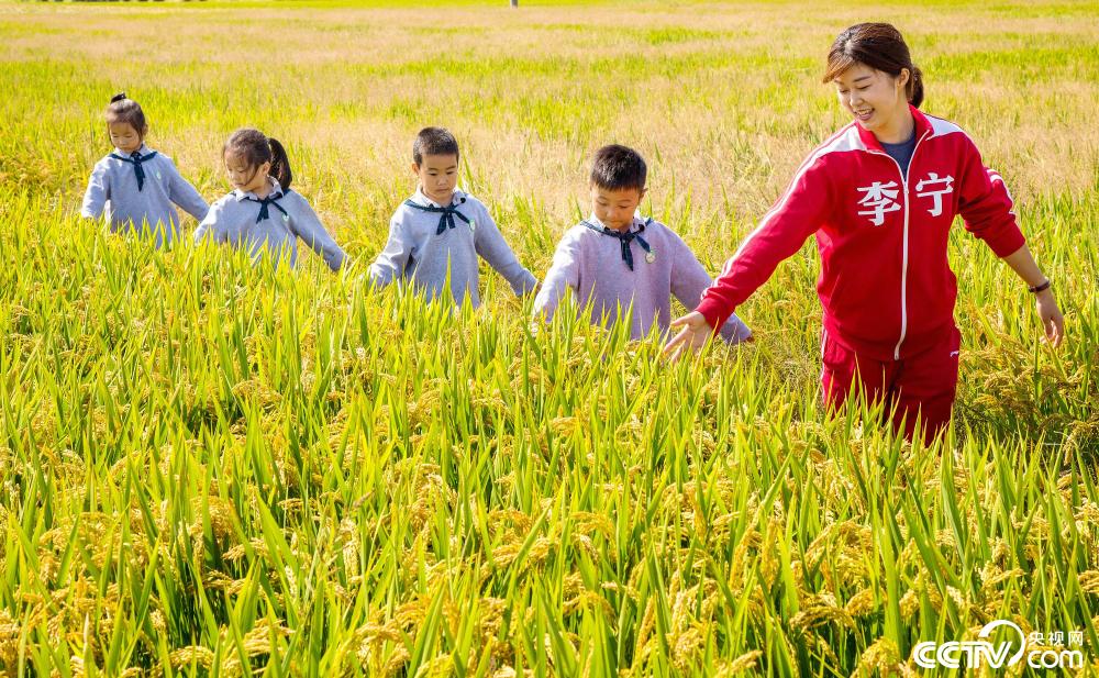 2019年10月15日,浙江省湖州市長興縣開發(fā)區(qū)實(shí)驗(yàn)幼兒園的老師帶領(lǐng)孩子們走進(jìn)稻田,感受豐收的喜悅。圖片來源:視覺中國