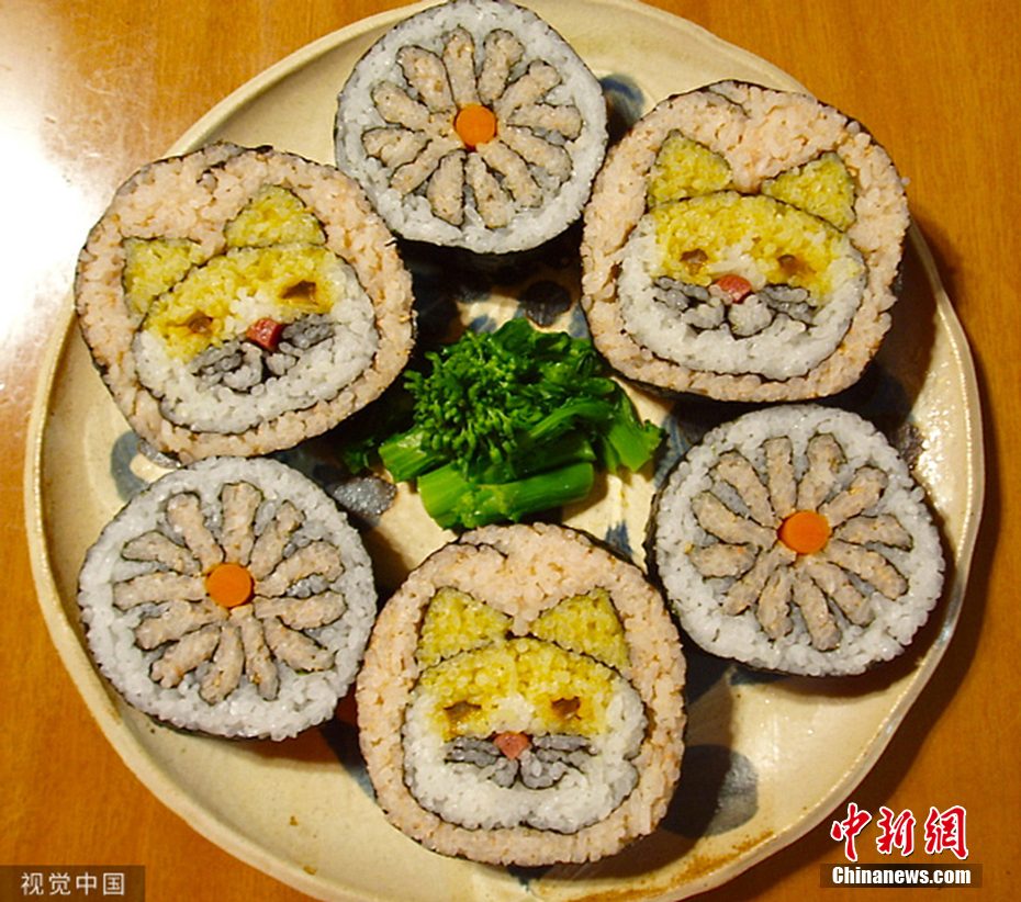 日本壽司廚師利用著色大米和海藻,制作出了貓咪、子宮中的嬰兒、美人魚(yú)以及名畫(huà)。奇妙的是,不把壽司切成片,就不知道她制作的究竟是什么圖案。圖片來(lái)源:視覺(jué)中國(guó)