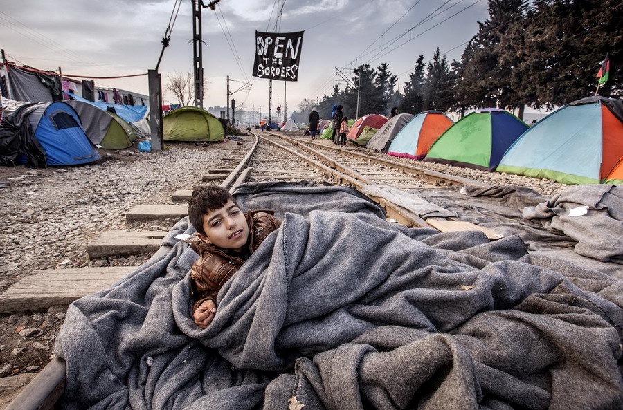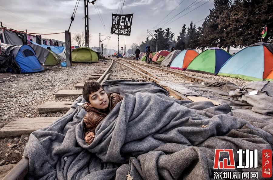當(dāng)?shù)貢r(shí)間2016年3月22日,希臘伊多梅尼,來(lái)自敘利亞阿勒頗的難民男孩躺在鐵軌上睡覺。