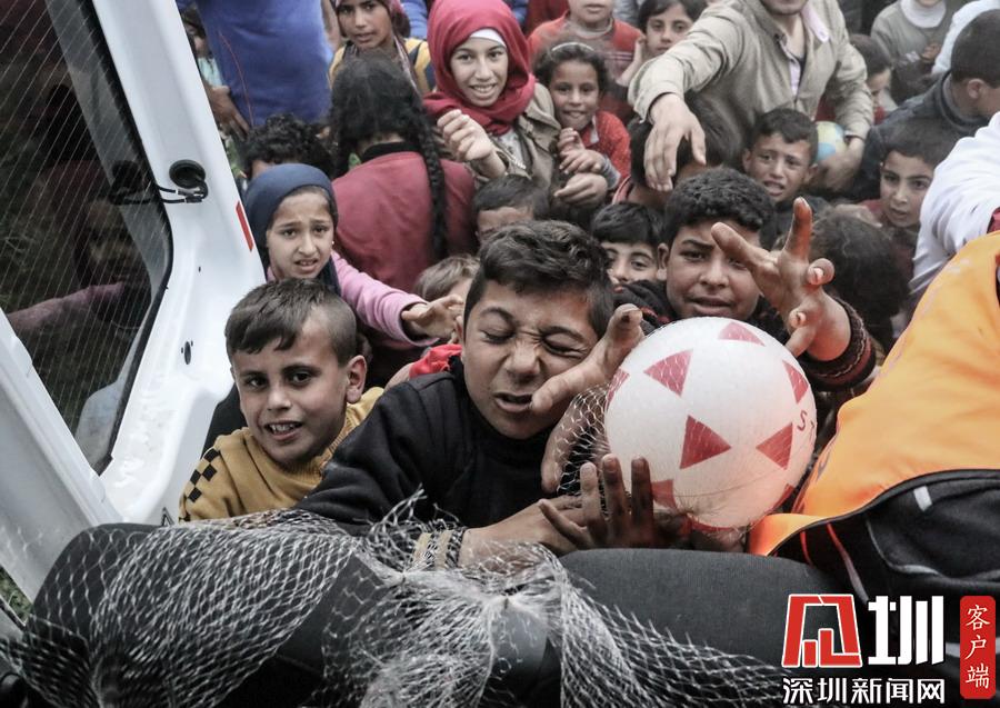 當(dāng)?shù)貢r(shí)間2018年3月18日,敘利亞阿勒頗,敘利亞難民領(lǐng)取災(zāi)害和應(yīng)急管理機(jī)構(gòu)提供的糧食救援。1月20日,土耳其發(fā)動(dòng)針對(duì)敘利亞阿夫林地區(qū)庫(kù)爾德人的橄欖枝行動(dòng),阿勒頗諸多村鎮(zhèn)被清理,當(dāng)?shù)鼐用窦毙枞粘I罹仍?/p>