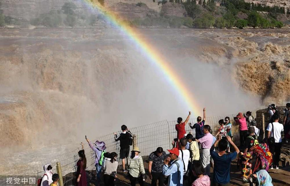2019年8月17日,山西臨汾,游客在吉縣黃河壺口瀑布欣賞“彩虹門”景觀。