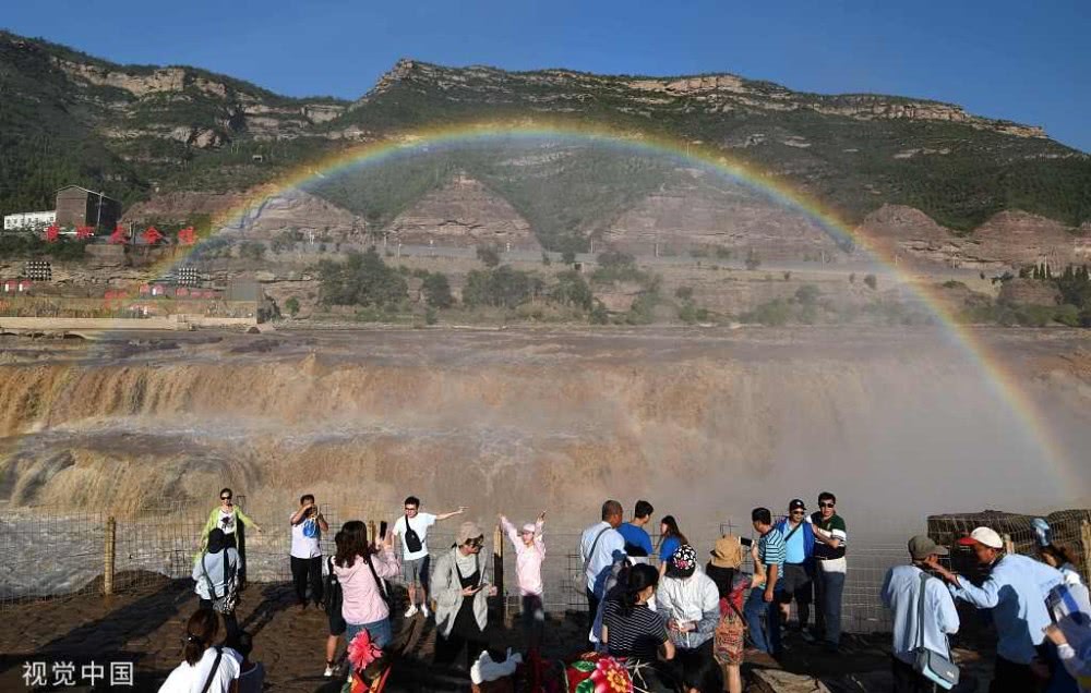 入秋以來,山西吉縣黃河壺口瀑布景區(qū)天氣晴好,黃河干流水量豐沛,壺口瀑布飛濺的浪花和水霧在陽光的照射下,形成“彩虹門”景觀,吸引了眾多游客。